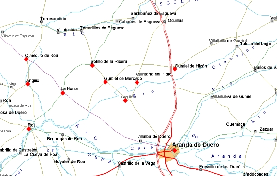 Ruta del Vino![]() LA MANCOMUNIDAD " RUTA DEL VINO AFUENTE RURAL" integrada pro los municipios LA AGUILERA, ANGUIX, GUMIEL DE IZAN, GUMIEL DE MRCADO,LA HORRA, ROA Y SOTILLO DE LA RIBERA, están al sur de la provincia Burgos y pertenecen a la Ribera del Duero burgalesa. La población media es de 500 habitantes y la actividad económica principal es la agricultura, trigo, cebada, girasol, y sobre todo el viñedo en las variedades de tinta del país y albillo que producen el prestigioso vino protegido por denominación de origen RIBERA DEL DUERO. Importante también es la cabaña de oveja de raza " churra", famosa por su reconocido lechazo y sus exquisitos quesos de leche de oveja. Apostando por un futuro rural dispone de cada vez mejores servicios, infraestructuras y actividades: piscinas, salas de exposiciones, complejos deportivos, bibliotecas, museos, estaciones de servicio, etc... a la vez que se están desarrollando unas infraestructuras turísticas importantes. La historia de estas poblaciones en algunos casos se inician en la Edad de Bronce y queda reflejada en la arquitectura, las tradiciones populares y también en los Archivos Históricos Municipales. ![]() GUMIEL DE IZÁN Declarada Villa Real en 1326 por el Rey Alfonso XI . el núcleo antiguo es conjunto histórico artístico (1965). Iglesia de Santa María. De los s.s. XV y XVI. Declarada Monumento Nacional. Retablo Mayor. Uno de los más importantes de su época en España, de finales del s. XV. Museo Parroquial. Pintura en tabla s. XV y escultura en talla s. XII AL XVIII. Colección de capiteles historiados románicos del antiguo Monasterio de San Pedro. Plaza Mayor. Con el más puro aire castellano, rodeada de casas con soportales de variada construcción: piedra, ladrillo galletilla, adobe y madera. En una de ellas vivió Santo Domingo de Guzman de pequeño. Arco de los Mesones. Puerta de la antigua muralla, por la que pasaba el camino real a Madrid, inscripción de 1786. Ermita de San Roque. Tiene retablos de la época del s. XVIII. Arquitectura Popular. Tradicionales casas del s. XVI, de adobe y entramado de madera, algunas con escudos heráldicos, situadas en la calle Real donde se hospedaba la realeza. Alguna casa del s. XV y posteriores. GUMIEL DE MERCADO Figurada por su historia entre las villas señaladas de Castilla. Alfonso X se la donó en lote a su hija Violante. Iglesia de San Pedro. Incorporada al templo parroquial se halla la torre – fortaleza con almenas y sencilla espadaña. Portada renacentista, retablo mayor, barroco. Cristo gótico del s. XIV. Iglesia de Sta. María la Mayor. Templo gótico del siglo XV. Retablo barroco del siglo XVIII. Ermita de San Juan. Gótica , se encuentra a las afueras en dirección a Gumiel de Izán, con zona de arbolado, fuente, mesas y asaderos. Real Sitio de la Ventosilla. Importante granja y centro vitivinícola. Palacio mandado construir por el duque de Lerma. El retablo es de formas góticas. Villa amurallada. De trazado mediaval, de la que queda parte del tapial y sendas puertas con arcos rematados con cruz y bolas, además de 9 casonas de piedra con escudos, blasones y soportales. Cerro con bodegas. LA AGUILERA. LA Aguilera, fue villa del señorío del Obispado de Burgos y más tarde de los Zuñiga. Casa Municipal. Situada en la plaza, de fabrica de piedra. Convento de San Pedro Regalado. Santuario franciscano "Domus Dei", donde se hallan las reliquias de San Pedro Regalado, patrono de los toreros y de Valladolid. Ha sido visitado por importantes personajes de la historia : Reyes Católicos, Cardenal Cisneros, Felipe II, Carlos V. la iglesia conventual originariamente de 1438 y reedificada en 1706, es barroca. En su cabecera se encuentra la capilla – camerín del Santo, con tres lienzos de la escuela de Velázquez. Iglesia de San Cristobal. s. s XV y XVI. Zona de Acampada. En sus proximidades. SOTILLO DE LA RIBERA Conjuga una población creciente y dinámica con un interesante conjunto urbano. Iglesia de Sta. Agueda. Barroca destaca su portada del siglo XVII obra de Domingo de Ondátegui. Palacio del Ayuntamiento. Edificio neoclásico con balcón y soportales de 1781. Palacio de los Serrano. Declarado bien de interés cultural ( s. XVIII) y restaurado como alojamiento rural. Exposición permanente de fósiles, minerales y tallas de madera. Casa de la Botica. Casona apalaciada del siglo XVII con todo el sabor castellano. Arquitectura Popular. Ermitas, zarzeras, lagares y bodegas del s. XVIII, excavadas en el Monte de San Jorge. Fuente. Obra herreriana mandada construir en 1610 por el Duque de Lerma, ubicada en una magnifica arboleda. Esculturas de Amancio Antón. En toda la población. LA HORRA Uno de los pueblos con mayor fama y prestigio gracias a sus vinos y bodegas. Iglesia de Ntra. Sra. De la Aunción. Del s. XVII, portada neoclásica a cargo de Domingo Ondátegui. Con sus elementos góticos en la zona de la pila bautismal. Destacan el retablo mayor y los bajos relieves. Arquitectura Popular. Casa de adobe y ladrillo neomudéjar. Cogollo. Conjunto de bodegas antiguas con lagares, donde sobresalen sus singulares zarzeras cónicas. Fuente de Abajo. Magnifíca fuente de dos caños con escudo blasonado del s. XVIII. Bodega. Rehabilitada para el museo del vino, al que se accede tras bajar 49 escalones. ![]() ANGUIX Por la cuesta de Manvirgo se divisa entre otros pueblos, a Anguix con sus numerosas Bodegas. Iglesia de Ntra. Sra. De la Asunción. Del s. XVII. Yesos neoclásicos y retablos dorados barrocos. Ermita de San Juan. En todo lo alto de una loma donde abundan las bodegas y desde la que se puede observar un magnifico paisaje y la silueta de los pueblos limítofes, fue edificada en 1776 y restaurada en 1995 por la asociación " Amigos de San Juan". Crucero Barroco. Cerca de la ermita se halla este crucero, de columna gruesa en el fuste y cruz escalonada. " Fuente de Allá". Pradera verde con arboleda y manantiales. RUTA CULTURAL Y FESTIVA Durante todo el año se des